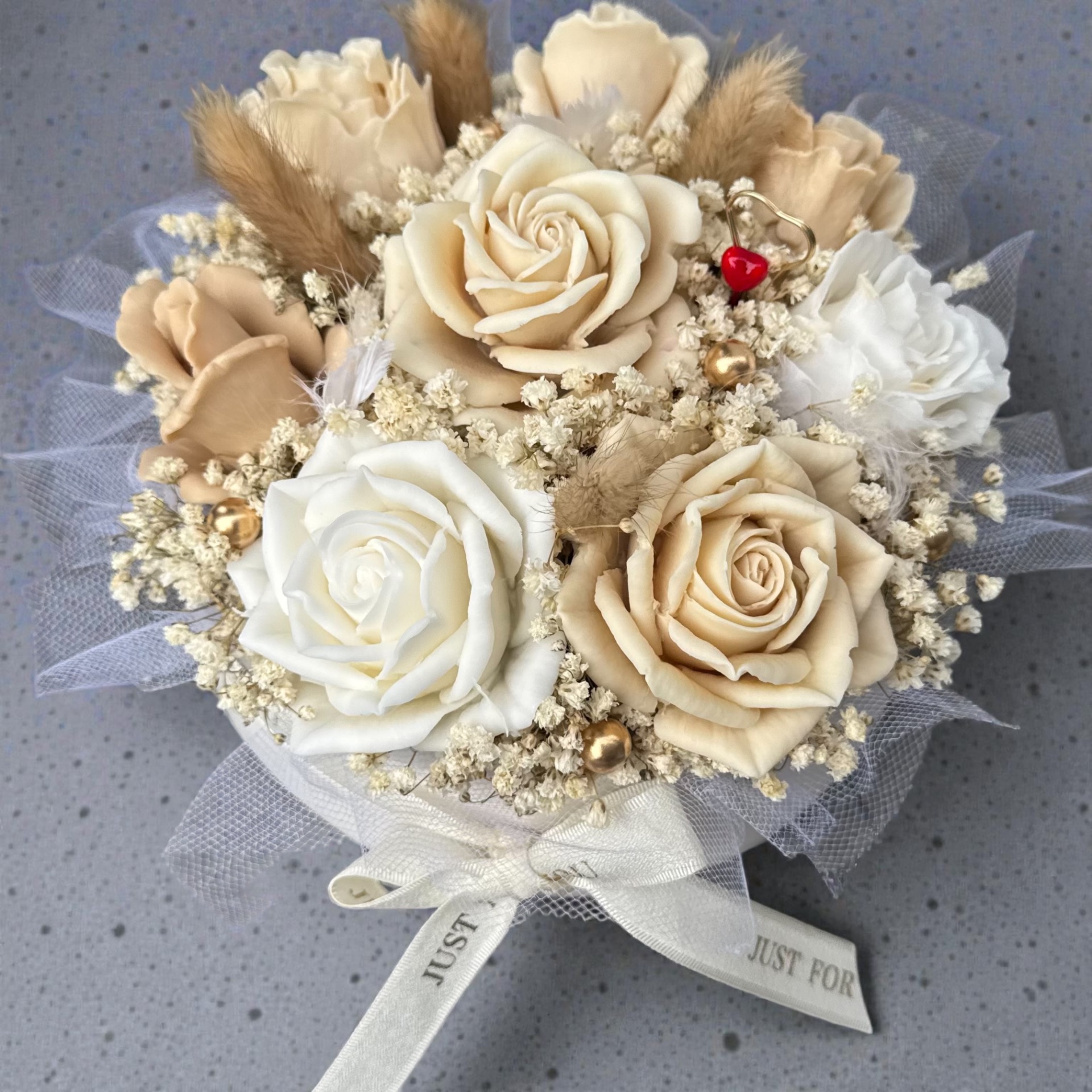 Keď luxus vonia mydlom. Nech každý Váš deň vonia pokojom a pohodou. Pre chvíle, keď si chcete oddýchnuť a rozmaznať sa." Nádherný kvetinový mydlový box v nádobe z eko hmoty s ružami v béžovej a bielej farbe zdobené nevädnúcou gypsomilkou. Na obrázku je box vo veľkosti M.
