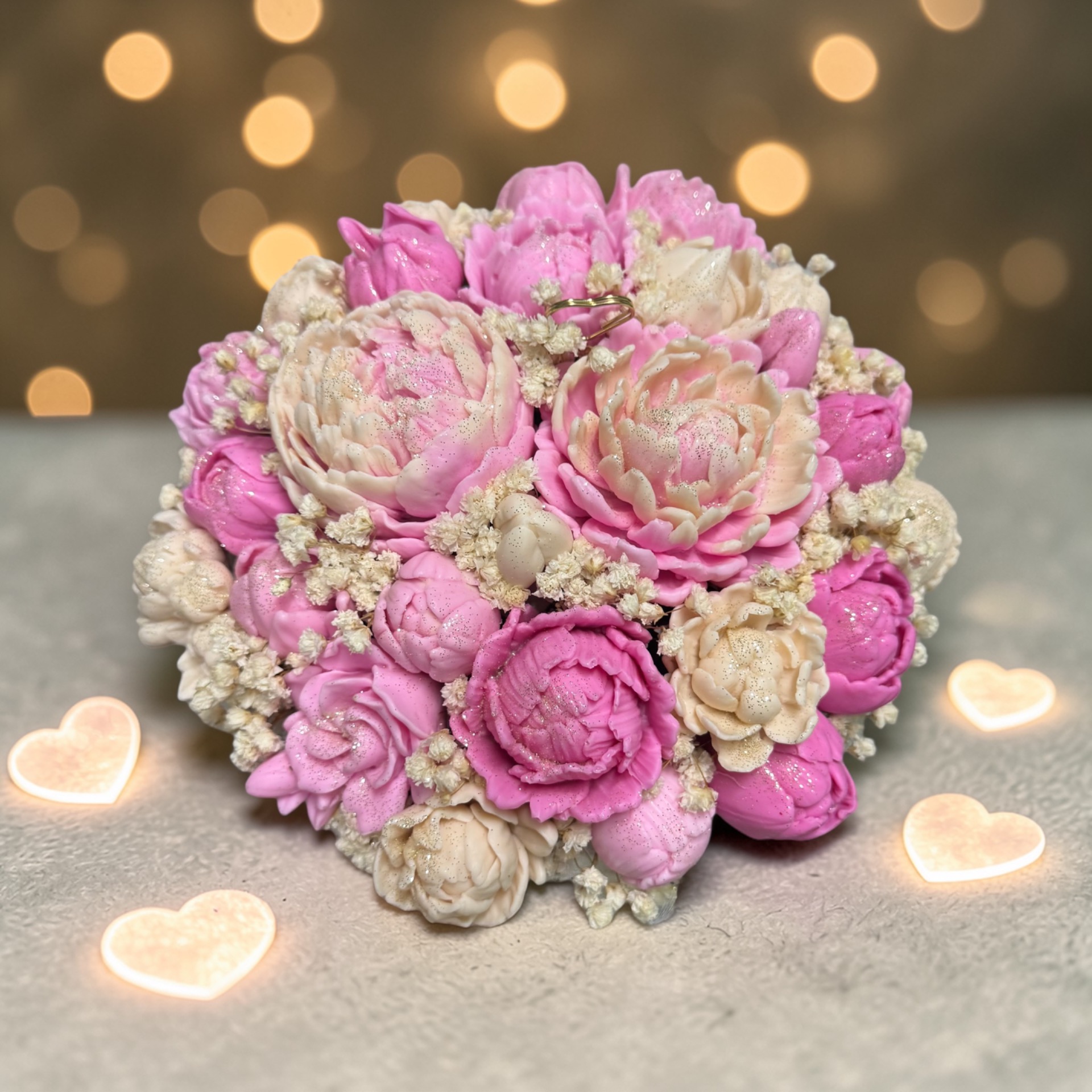 Keď luxus vonia mydlom. Nech každý Váš deň vonia pokojom a pohodou. Pre chvíle, keď si chcete oddýchnuť a rozmaznať sa." Nádherný kvetinový mydlový box v nádobe z eko hmoty s pivóniami v béžovej a ružovej farbe zdobené nevädnúcou gypsomilkou. Na obrázku je box vo veľkosti M.