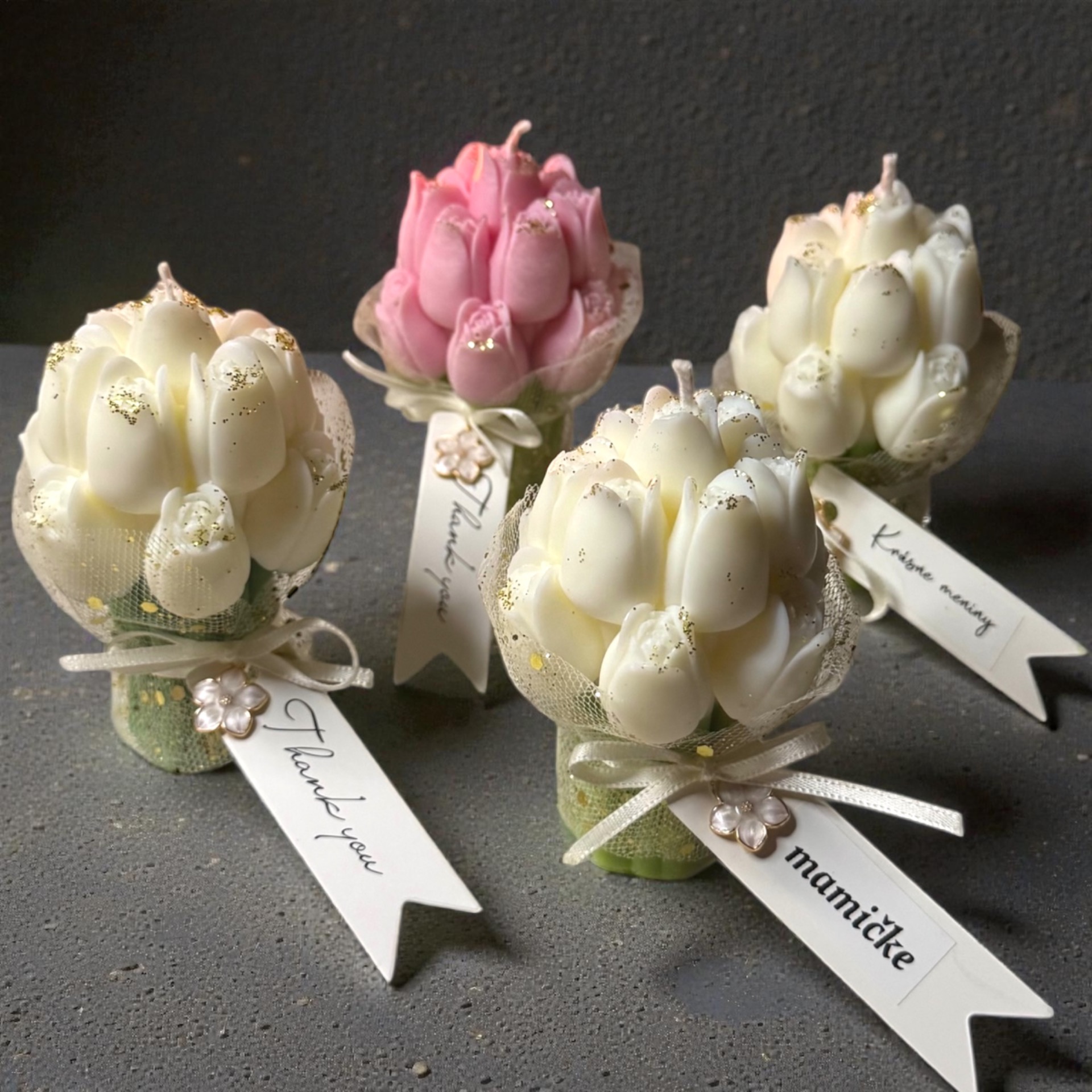 Ak si prajete vlastný text, prosím uveďte ho v poznámke na konci objednávky v časti „potvrdenie objednávky”. Ak text neuvediete na kartičke bude uvedené “Thank you”. Sviečka je dodávaná s obľúbenou vôňou „láska a dôvera”, ktorej dominuje zmyselný jazmín a santalové drevo, so stužkou a kvetinkou.
